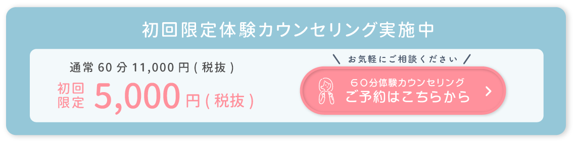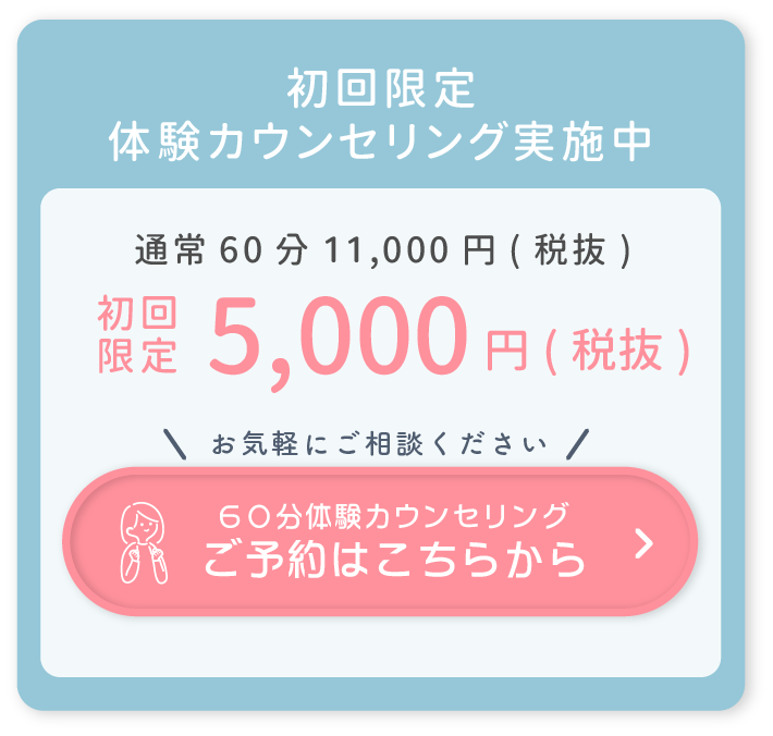 症状などで個人差がございますが、体験カウンセリングから約3ヶ月間ほどで回復する方もいれば、こころのメンテナンスとして定期的に通われる方もいらっしゃり、心理カウンセリングの使い方は人それぞれです。 体験カウンセリングで現在の貴方のこころの状態や不調の要因についてお伝えしますので、ご不安な点などお気軽にご質問いただき、相談しながら決めてまいりましょう。