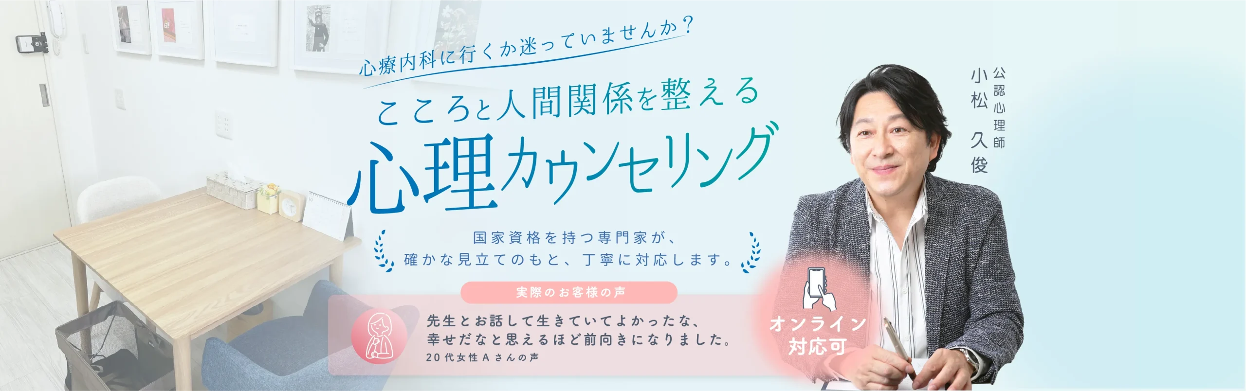 そんな中、小松先生の心理 カウンセリングを受けました。初の対面カウンセリングで緊張していたのですが、穏やかな雰囲気で、時に楽しく時に真剣に、私の考え方の癖を探ってくださいました。